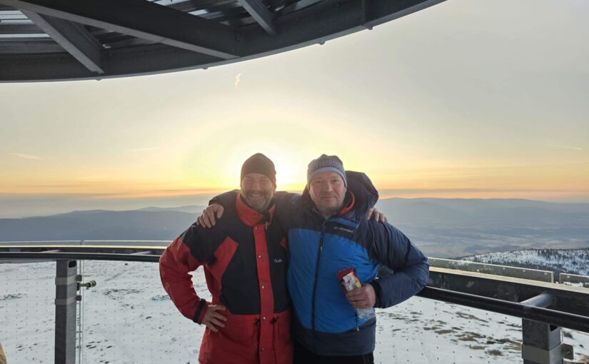 Kolem půl jedenácté už vyrážíme do kopce po modré ve směru na rozhlednu Klepáč. Dolní Morava leží v nadmořské výšce nějakých 600 mnm a dnes máme v plánu se dostat až k vrcholu Králického sněžníku, který leží ve výšce 1 423 mnm a představuje 8. nejvyšší vrchol České republiky. Vyšších je pouze 5 vrcholů v Krkonoších a 2 vrcholy v Hrubém Jeseníku. Máme tedy před sebou převýšení nějakých 800 metrů a zhruba 15 kilometrů, téměř celou dobu do kopce, takže poměrně kvalitní výšlap. Asi po půl hodině docházíme na parkoviště pod Klepáčem, které leží ve výšce 853 metrů, takže až sem bychom mohli dojet autem. Krom našeho přesvědčení, že kopec se má vyšlápnout po svých, jdeme pěšky i proto, že by nás jinak tato část cesty čekala v neděli odpoledne při výšlapu z údolí Moravy, což by asi bolelo ještě o trochu více. Zde se napojujeme na červenou značku „Hřebenovka“, která vede po hřebeni až na Králický Sněžník. Slunce má čím dál větší sílu, a tak postupně odkládáme jednotlivé vrstvy oblečení. Na hřebeni nasazujeme „nesmeky“, neboť jsou zde dlouhé zledovatělé úseky. Jinak sníh tu zatím není téměř žádný. Kolem poledne již stojíme na rozhledně Klepáč ve výšce 1 143 mnm. Zde je již poměrně rušno. V krásném počasí si evidentně vyrazilo spoustu lidí na sobotní výlet. Z rozhledny je krásný výhled zejména na skiareál Dolní Morava, pod rozhlednou stojí několik pivních lavic, na kterých svačí hloučky lidí. Také si jednu lavici zabíráme a rozbalujeme oběd, který zapíjíme pivem z plechovky, kterou jsme si s sebou přinesli na posilněnou. Víme, že první hospoda je až na Schronisku pod Snieznikem, a navíc si nejsme jistí, zda bude otevřená. S plnými bříšky si leháme asi na půl hodiny na lavici a opalujeme se. Tak takhle by to šlo! Po 13 hodině již pokračujeme dál po hřebeni. Začíná přibývat sněhu, a tak cestou pokukujeme, jestli by se nedalo někde postavit iglú. Záměrem je ale dojít až na chatu, dát si tam večeři a pivo a najít nějaká místo kousek od chaty, kde bychom iglú postavili. Jdeme tedy dál ve svižném tempu v očekávání lahodného polského piva.